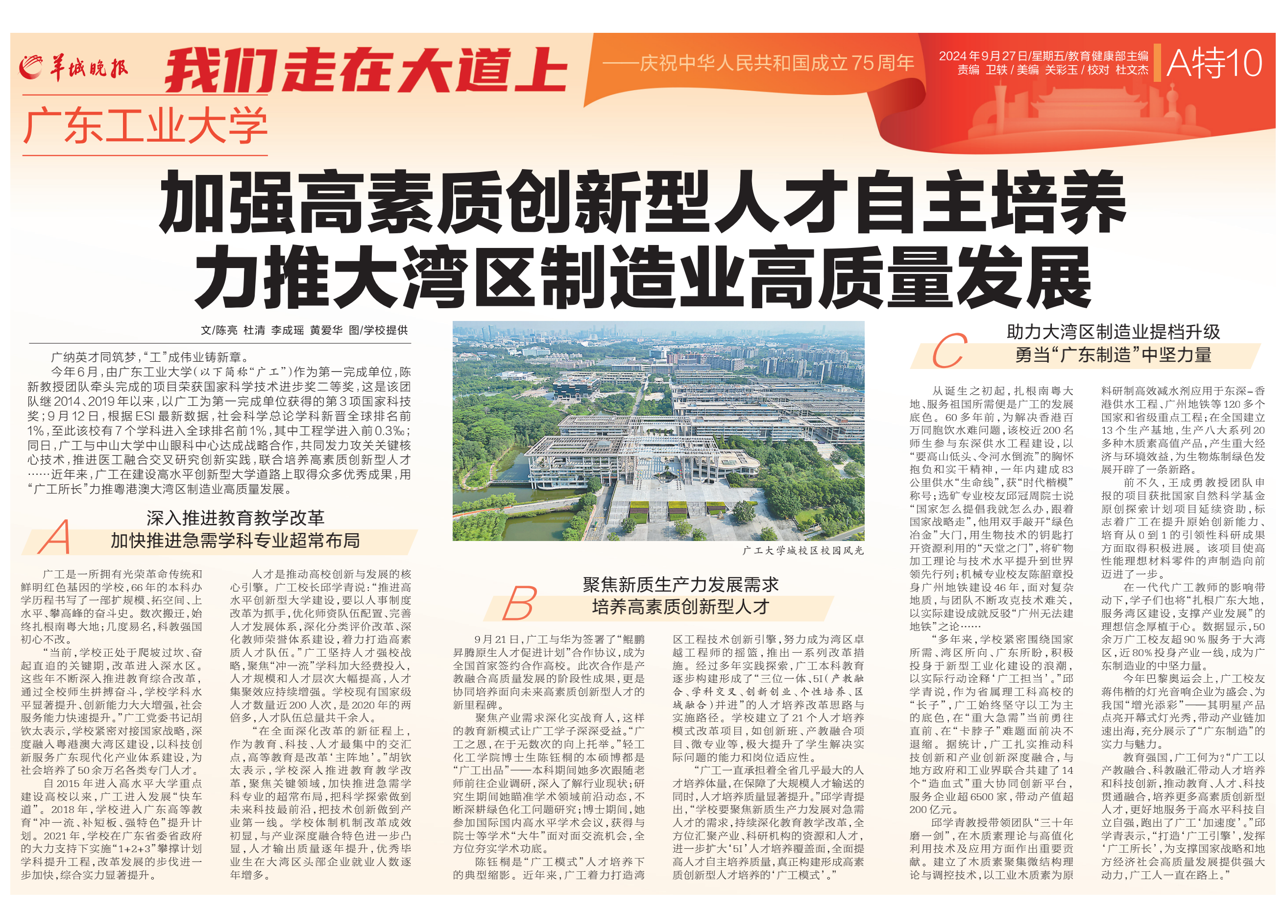 网址链接:羊城晚报-加强高素质创新型人才自主培养 力推大湾区制造业高质量发展 (ycwb.com)