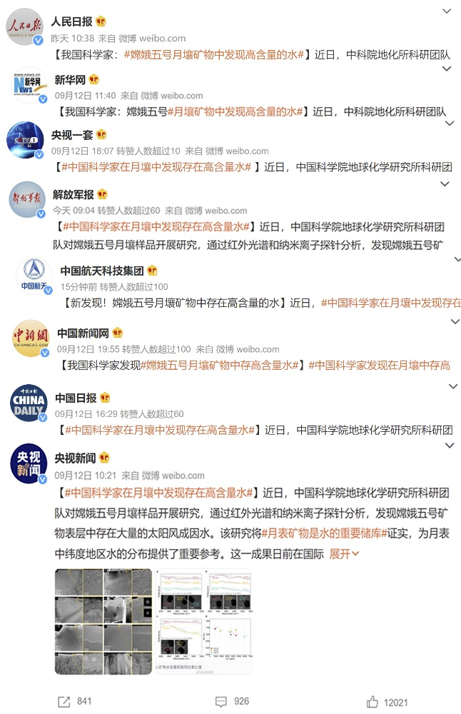 该研究证实了月表矿物是水的重要“储库”,为月表中纬度地区水的分布提供了重要参考。这一成果日前在国际学术期刊《Nature Communications》发表。该成果被国内包括人民日报和央视新闻等上百家主流媒体争相报道。