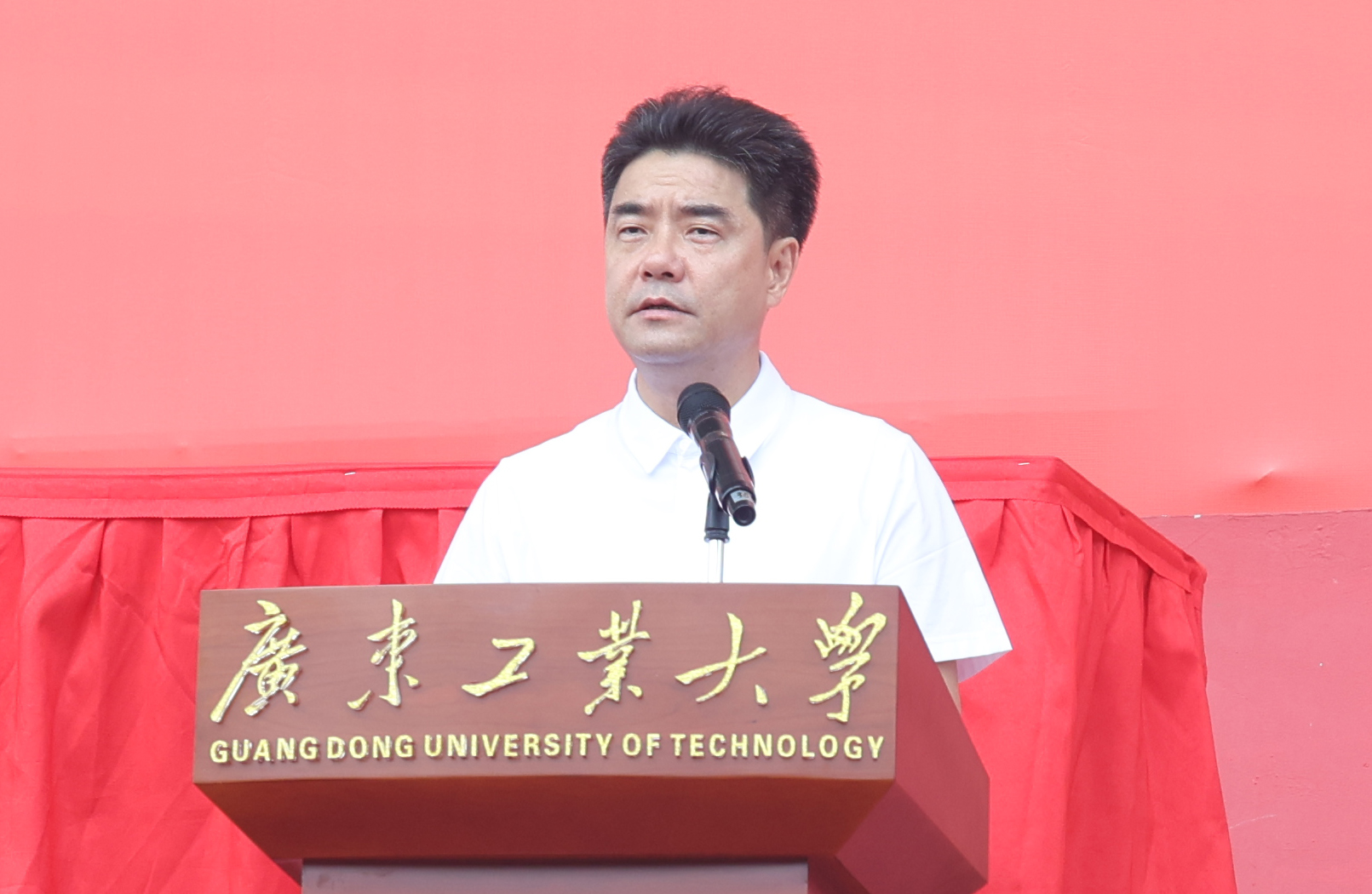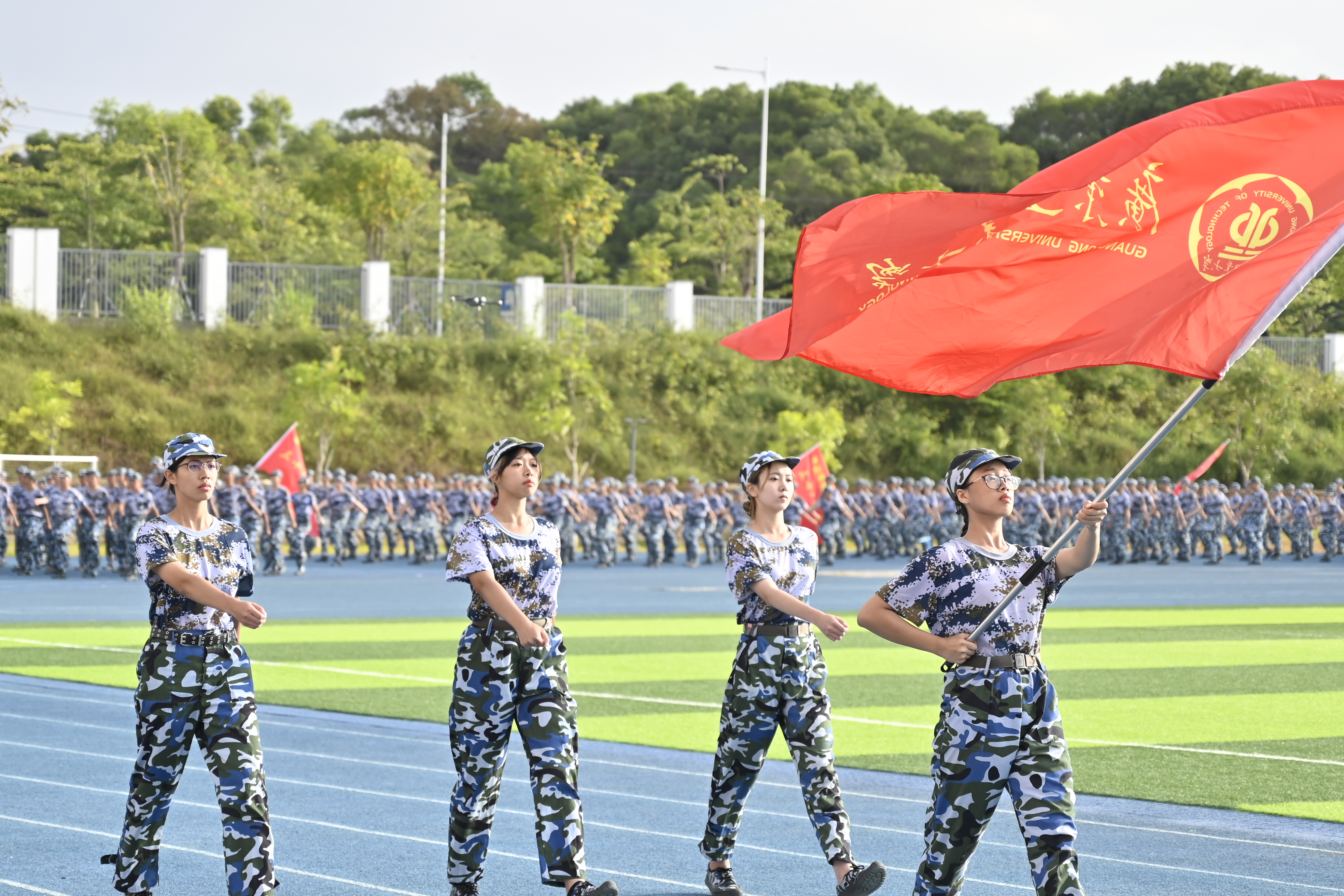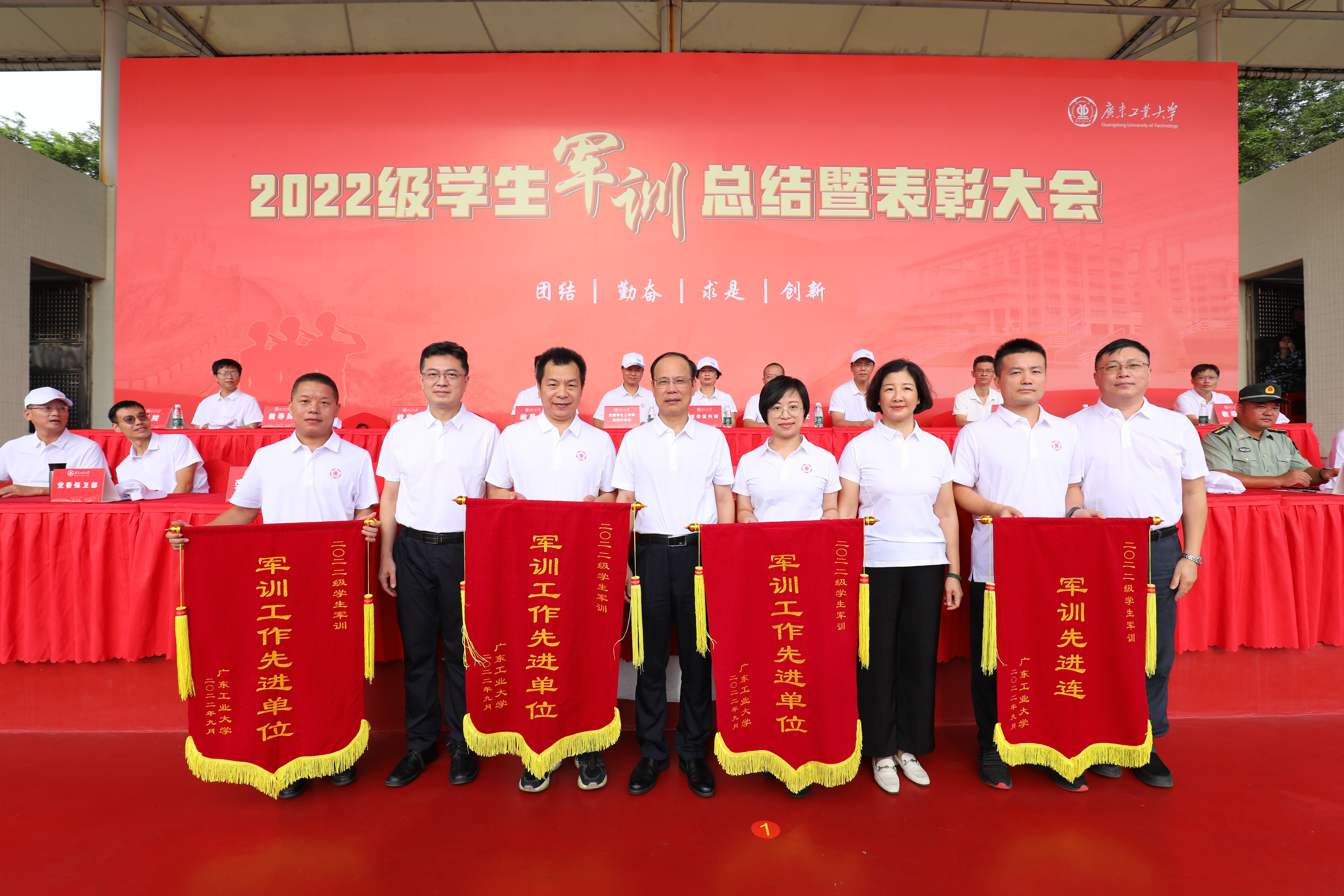 胡钦太、邱学青向承训单位越秀区人民武装部赠送锦旗。陈良友、朱蔚蔚、栾天罡宣读《关于表彰2022级学生军训先进集体和先进个人的决定》,校领导向获奖集体和个人代表颁发了锦旗。