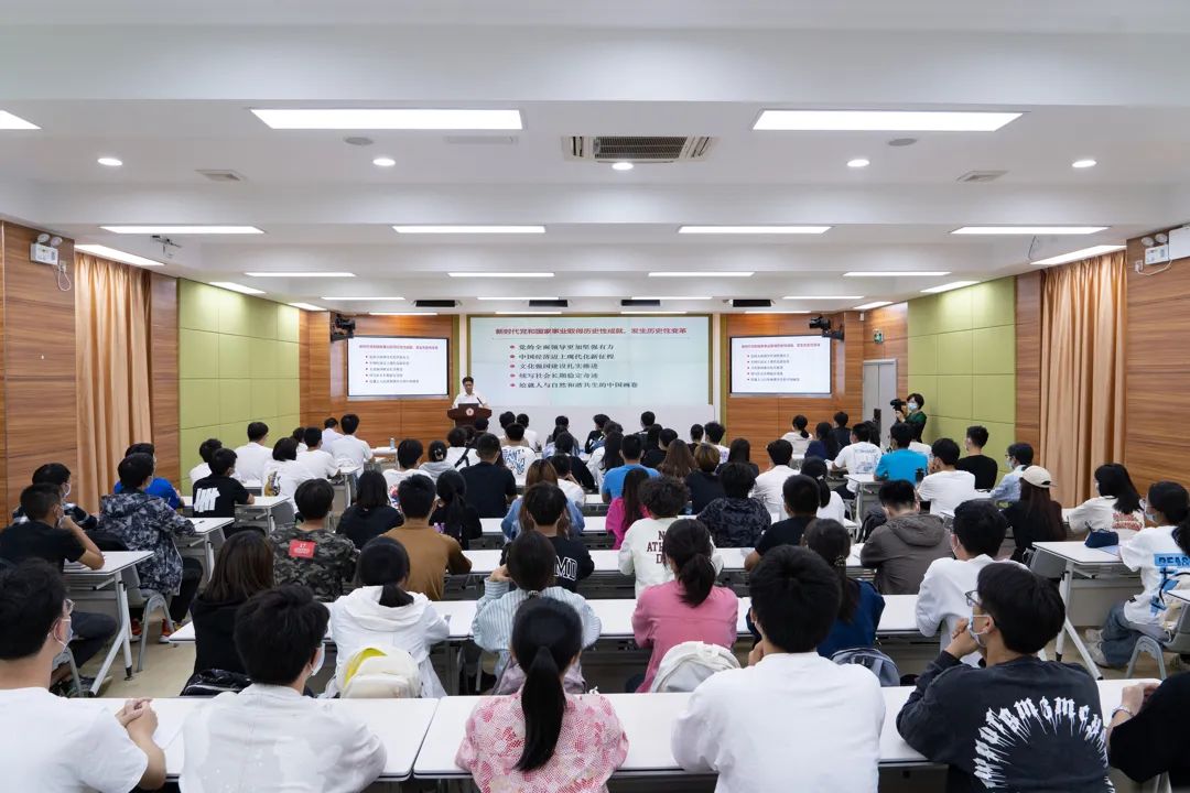 课堂上,有引人深思的形势分析,也有感人至深的奋斗故事;有大量鲜活的案例,也有身边的故事演绎,还有书记校长的自身经历和感悟……两个小时的课程,内容丰富、逻辑清晰、图文并茂,触动了大家的求知“困惑点”、内心“需求点”、情感“触发点”和思想“共鸣点”,形象生动地为同学们带来了一顿思政“大餐”,让这堂思政课有根有魂站了起来、有理有据实了起来。