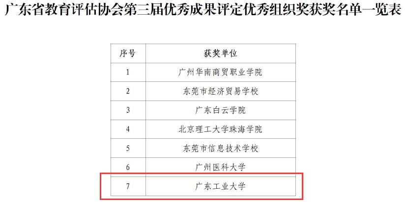 近日,广东省教育评估协会公布了第三届优秀成果奖获奖名单,共评选出优秀成果奖123项,其中特等奖2项、一等奖13项、二等奖24项、三等奖41项、优秀奖36项、优秀组织奖7项。乐玩官方(中国)总部共6项成果获奖,其中特等奖1项(高等教育类唯一获奖),一等奖1项,二等奖3项,三等奖1项;学校同时获评优秀组织奖。