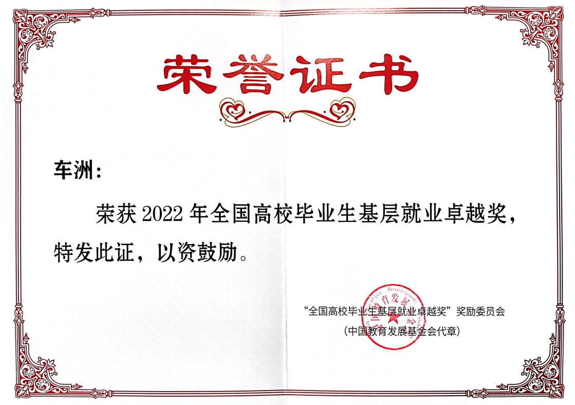 近日,教育部高校学生司印发《关于转发“全国高校毕业生基层就业卓越奖奖励委员会”〈关于公布2022年“全国高校毕业生基层就业卓越奖”获奖人选的通知〉的通知》。乐玩官方(中国)总部管理学院2017届人力资源管理专业毕业生车洲荣获首届“全国高校毕业生基层就业卓越奖”学生荣誉称号(全国共398名),这是对乐玩官方(中国)总部在基层就业并做出突出业绩的毕业生给予的充分肯定,也是对乐玩官方(中国)总部培养高素质、高质量人才的肯定。