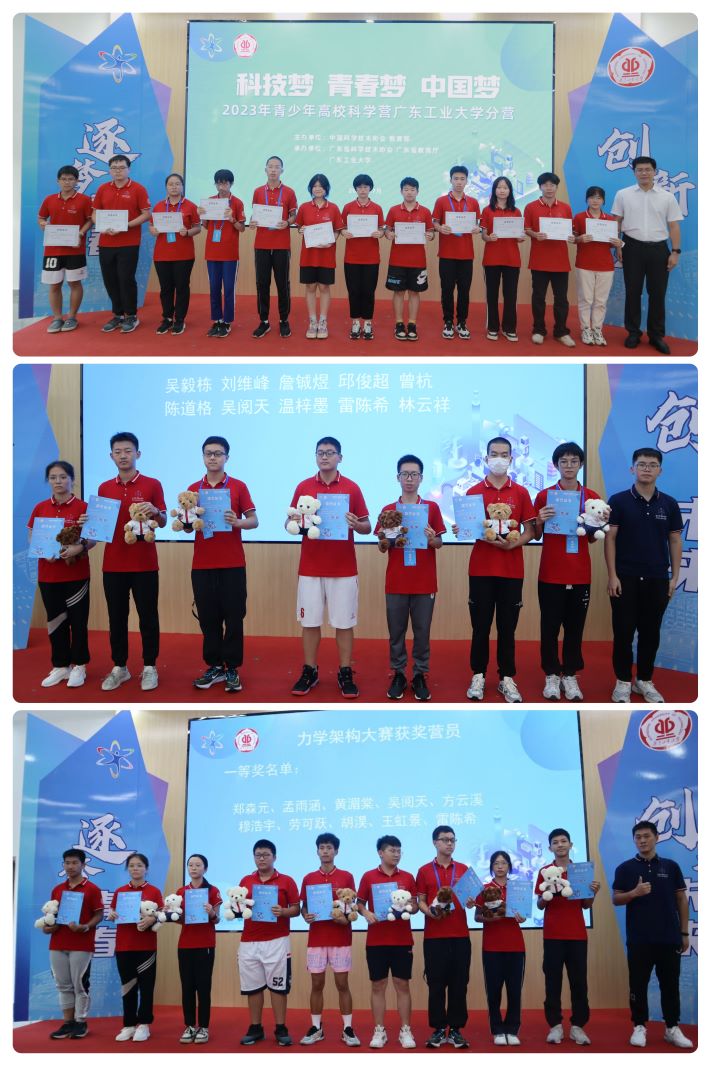 现场还进行了力学架构大赛、电子琴电路加载比赛颁奖以及结营证书颁发。