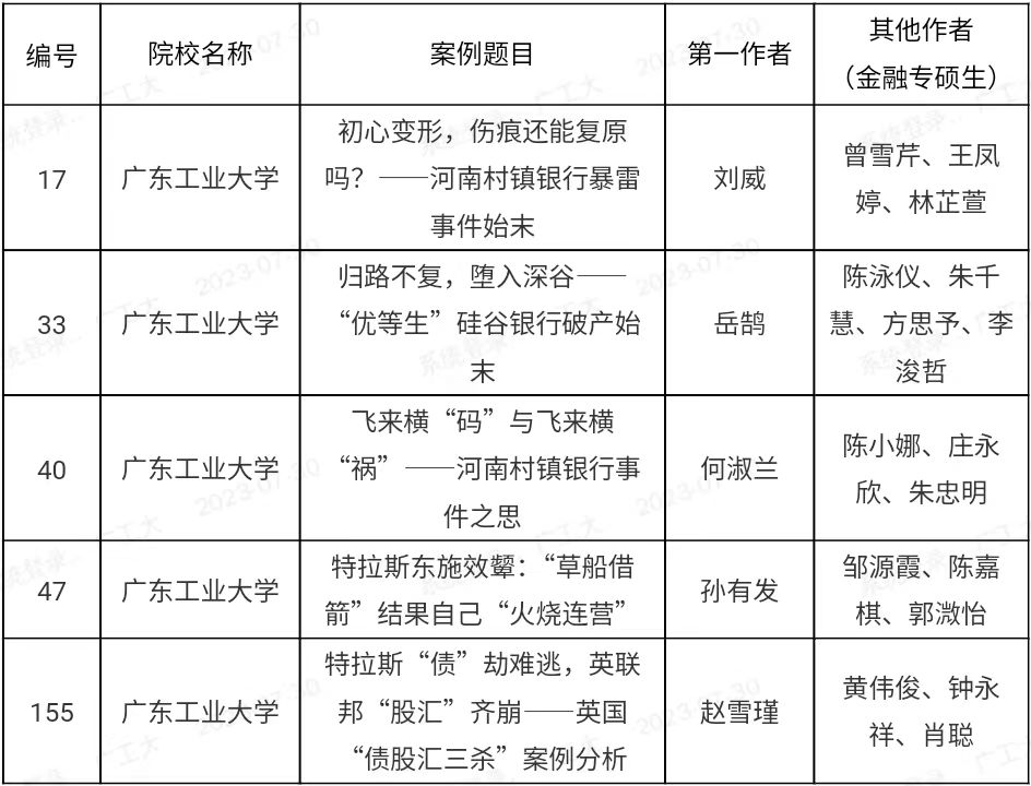 这是我学院连续第4年参加该赛事并获奖,2020年共2篇荣获优秀并入选案例库,2021年共1篇荣获优秀并入选案例库,2022年共3篇荣获优秀并入选案例库,2023年共5篇荣获优秀并入选案例库。我院将继续鼓励研究团队开发高质量的、具有原创性、实用性和针对性的金融专硕教学案例,不断推动学院案例教学水平的持续提高,提升学院学科建设迈向更高层次。据悉,在本次案例征集活动中,华南理工大学、华南师范大学、深圳大学、广东外语外贸大学、广东财经大学和广东金融学院的获奖作品数量各为1项。