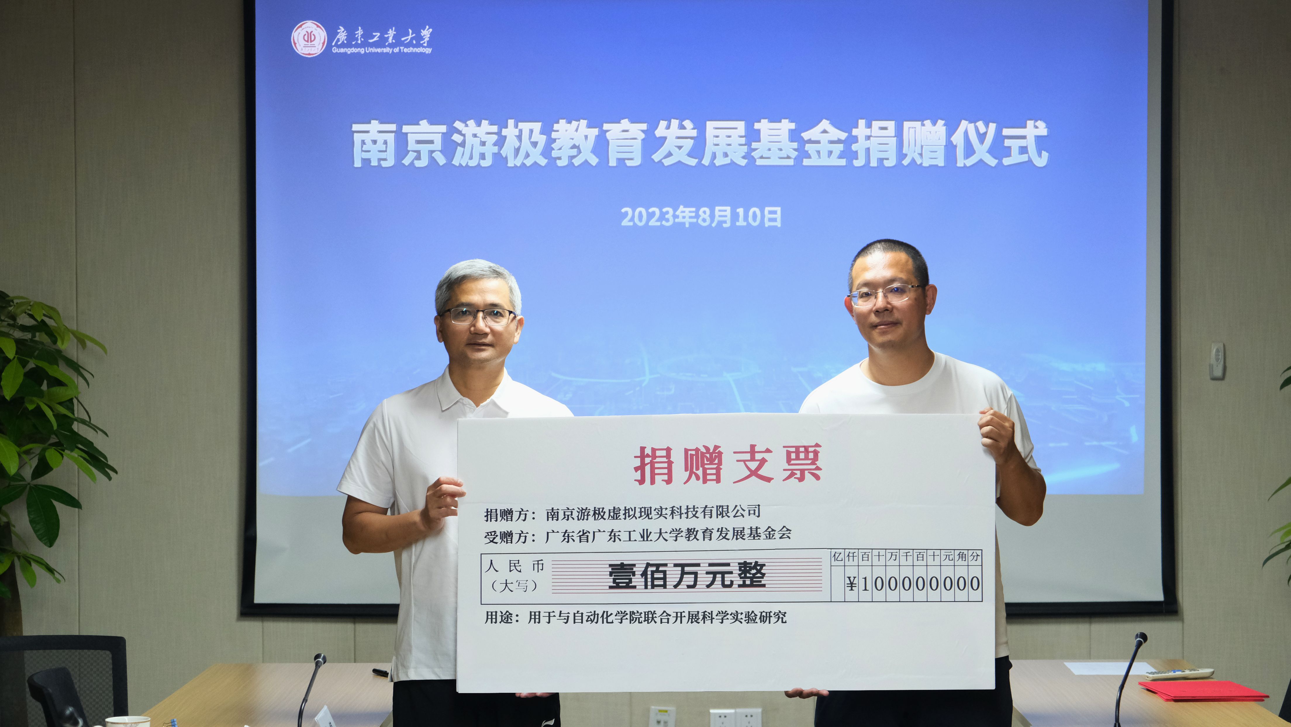 捐赠仪式上,陈卓武代表学校接受捐赠支票并颁发捐赠证书。双方签订捐赠协议书和产学研合作实施方案。