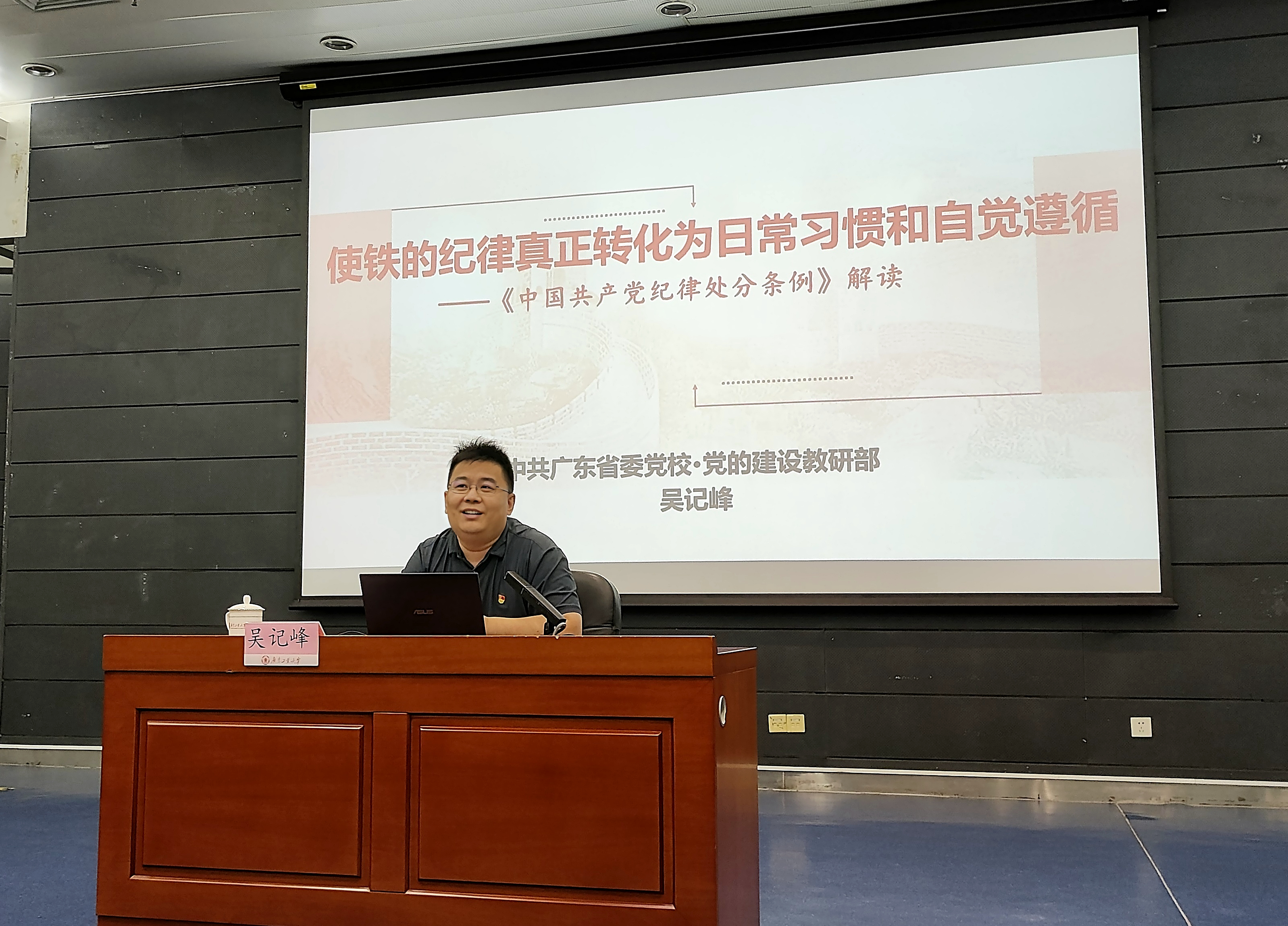 5月22日下午,学校依托“星火讲堂”举办党纪学习专题讲座,邀请中共广东省委党校党的建设教研部副主任、广东党建研究中心研究员吴记峰作专题报告,对党员学习新修订的《中国共产党纪律处分条例》(以下简称“条例”)进行集中辅导。