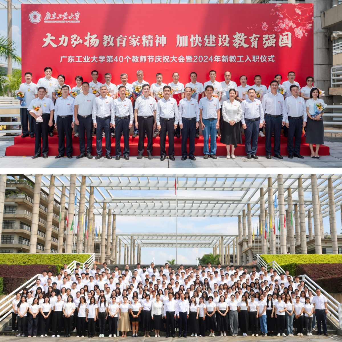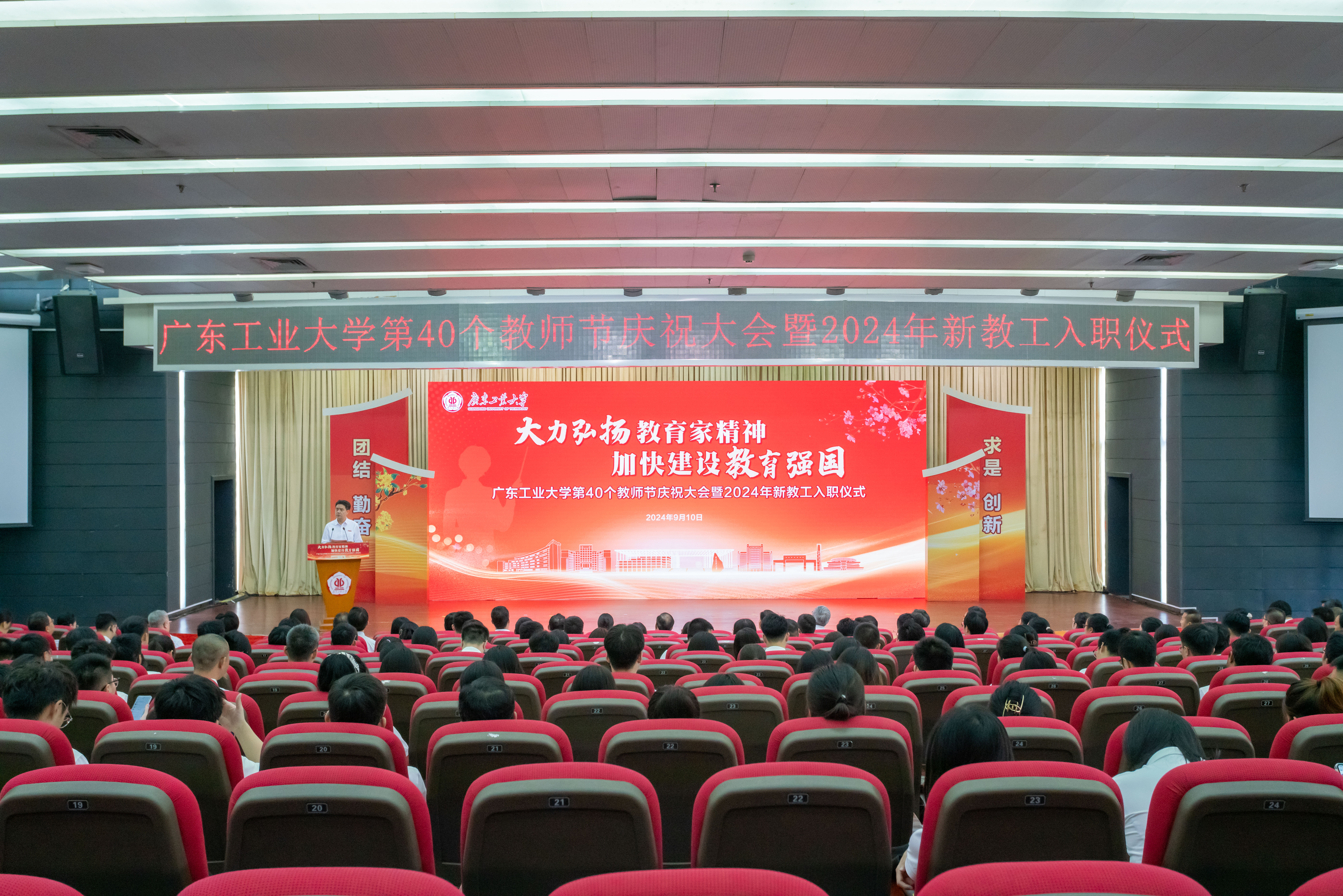 9月10日上午,学校在大学城校区大讲堂三楼中心报告厅举行第40个教师节庆祝大会暨2024年新教工入职仪式。 6位一线教师荣获“教书育人奖”,20位光荣从教35年以上教职工荣获“忠诚服务奖”,302名新教工庄重宣誓成为人民教师。学校党委书记胡钦太,党委副书记、校长邱学青,党委副书记陈良友、朱蔚蔚、陈卓武,副校长余林,党委常委、副校长鲁仁全、王振友,党委常委、纪委书记、广东省监委驻乐玩官方(中国)总部监察专员庞建国,党委常委、副校级干部张学理,党委常委、宣传部部长张育广出席大会,校党委教师工作委员会成员、各二级党组织书记、“教书育人奖”与“忠诚服务奖”获奖教师、离退休教师代表、新入职教工等参加了大会。揭阳校区教师代表在分会场参会。大会由朱蔚蔚主持。