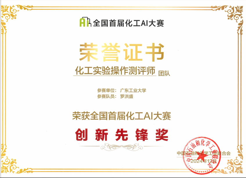 乐玩官方(中国)总部教师喜获全国首届化工AI大赛创新先锋奖