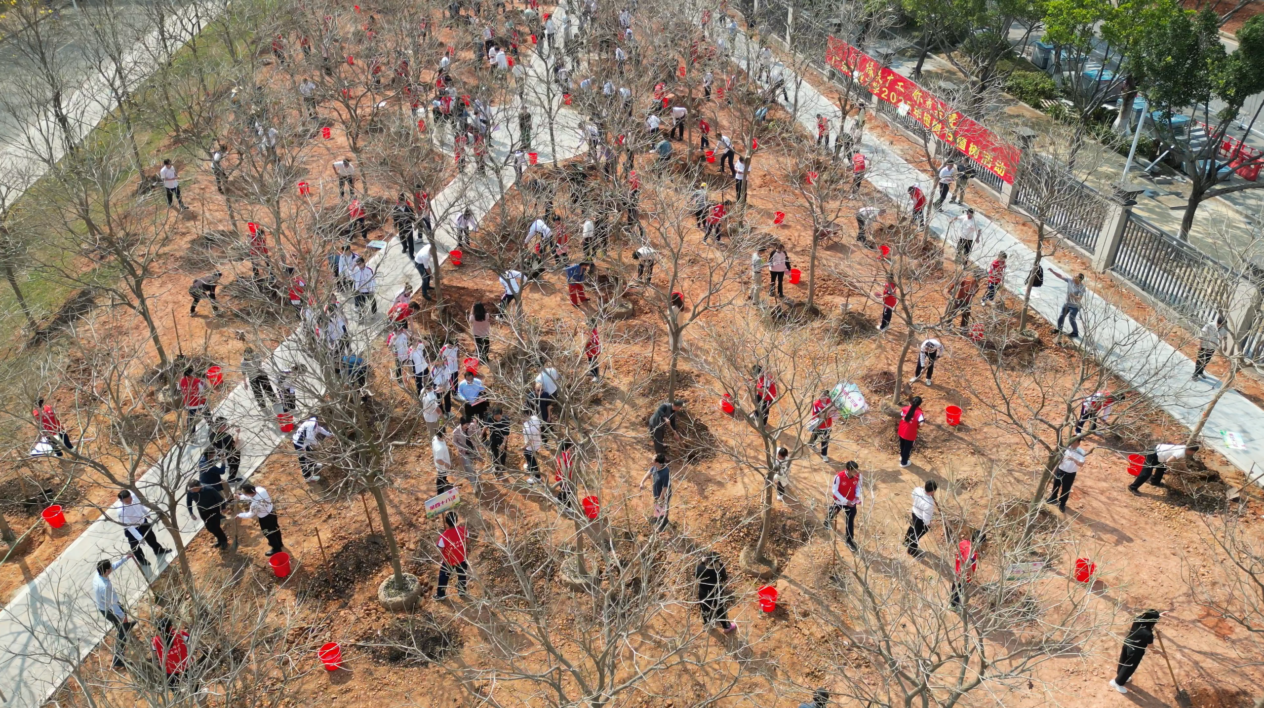 校长邱学青,党委副书记朱蔚蔚、陈卓武,党委常委、副校长杜承铭,副校长余林,党委常委、副校长鲁仁全、王振友,党委常委、纪委书记、广东省监委驻乐玩官方(中国)总部监察专员庞建国,党委常委、宣传部部长张育广,学校各相关单位、部门负责人,捐赠代表,大学城校区各学院师生代表及志愿者,分别组成60个植树小组,共同种植90余棵紫花风铃木。