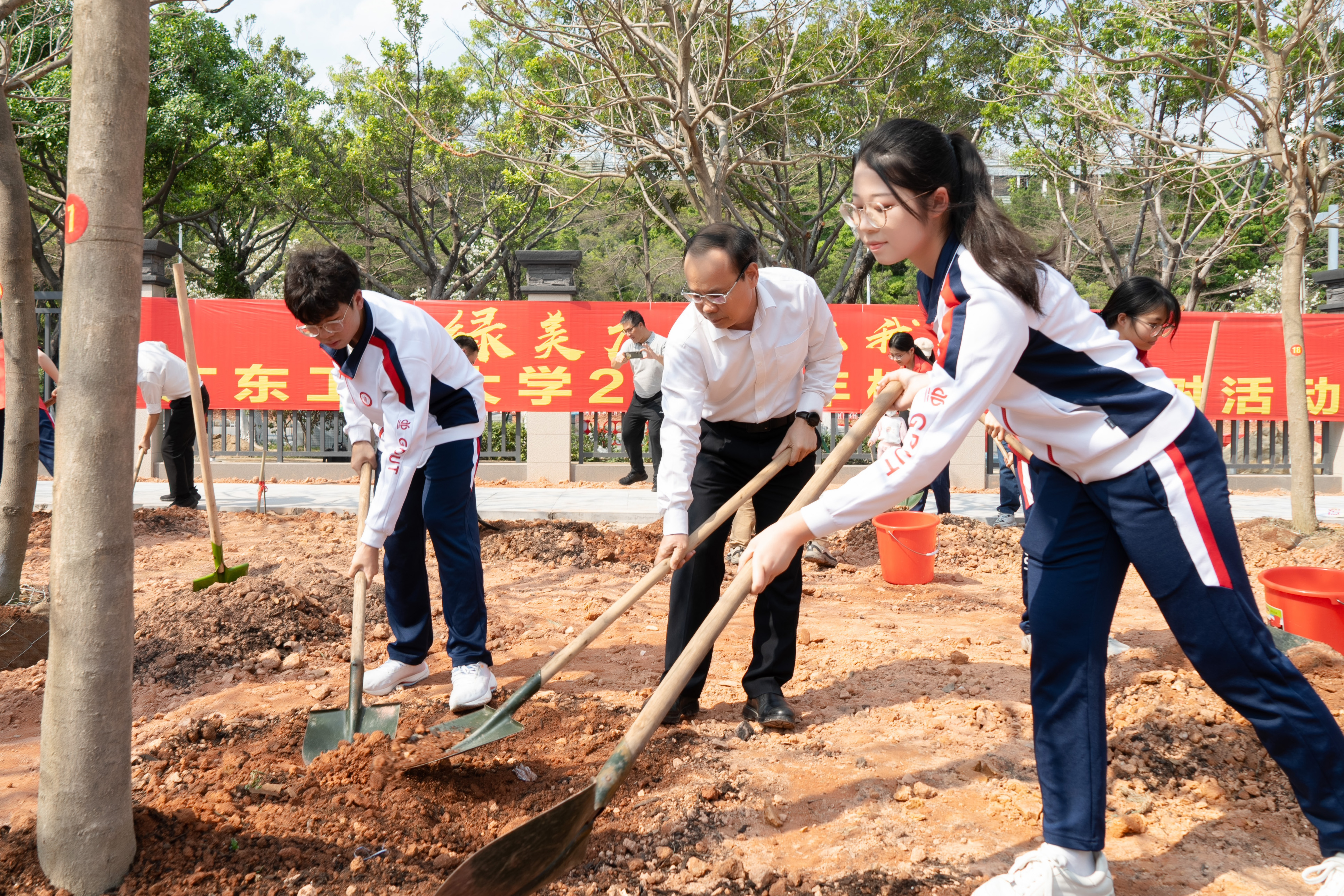 参加劳动的师生一起扶苗培土、拎桶浇水,气氛热烈。“这是一堂生动的劳动教育课。我们种下树苗,就是种下春天的希望。”邱学青一边与同学们植树,一边亲切交流,号召大家在热火朝天的劳动中磨炼意志,了解自然,强化环境保护意识,为美丽中国和绿美广东建设添砖加瓦。