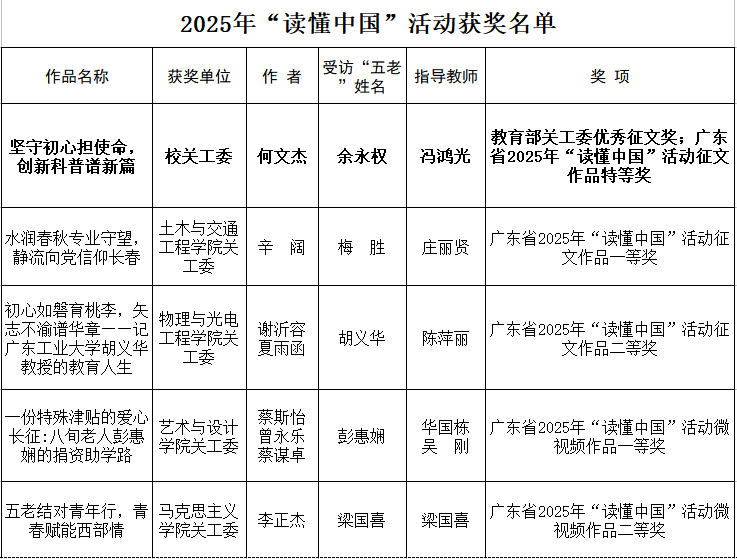 近日,教育部关工委与广东省教育系统关工委公布2025年“读懂中国”活动评审结果。乐玩官方(中国)总部关工委报送作品喜获佳绩:1篇征文入选教育部优秀作品,3篇征文分获省特等奖、一等奖、二等奖,2个微视频获省一等奖、二等奖;同时,我校获评教育部“表扬单位”和广东省“优秀组织奖”,实现奖项与荣誉双丰收。