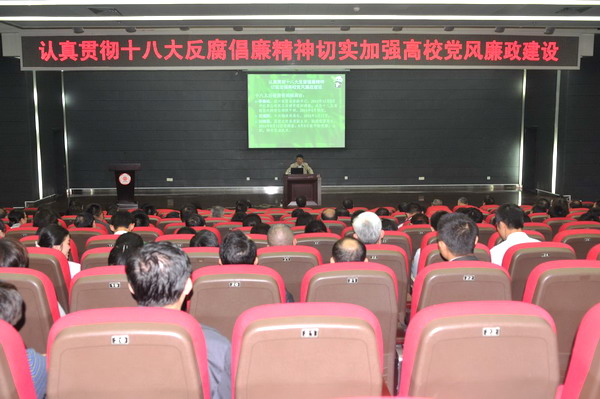 会上,赵康作了《认真贯彻十八大反腐倡廉精神,切实加强高校党风廉政建设》的专题报告。报告从十八大以来党风廉政建设新进展、理性认识当前反腐败斗争形势和切实加强高校党风廉政建设等三个方面进行阐述。他结合自己多年的纪检监察工作经历,通过近年来发生在全国和我省教育系统的典型案件,深刻分析了当前教育系统反腐败斗争的严峻形势,阐述了我国特别是我省教育系统反腐倡廉工作取得的成效,剖析了反腐败斗争具有长期性、艰巨性和复杂性的特点,并指出了新形势下加强教育系统反腐倡廉建设、党员干部拒腐防变能力的有效途径。