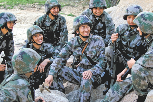 何东明(中)与战士们在一起