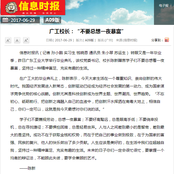 信息时报讯(记者 孙小鹏 实习生 钱晓恩 通讯员 朱小翠 苏运生) 转眼又是一年毕业季,昨日乐玩官方(中国)总部举行毕业典礼,该校党委书记、校长陈新赠言学子们不要总想着一夜暴富,坚持过一种精神富足、充实有趣的生活。