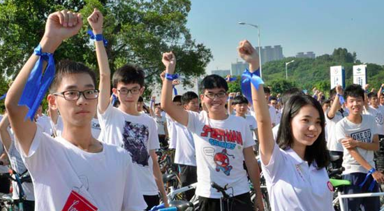 仪式上还进行最后全场共同倒数,挥舞蓝丝带并启动数字“30”人墙翻牌活动。紧接着,10所高校志愿者参加了“挑战蓝”骑跑宣传行动。300余名志愿者骑着自行车,在队伍前开路,后面是浩浩荡荡的3000余名志愿者一起奔跑。他们把蓝丝带系在手腕、系在自行车头,从乐玩官方(中国)总部正门广场到创客空间,一路骑跑而来,蓝丝带迎风飞舞。“挑战蓝”骑跑宣传行动彰显了志愿者的青春力量,让志愿者们成为“挑战杯”最美丽的代言人。
