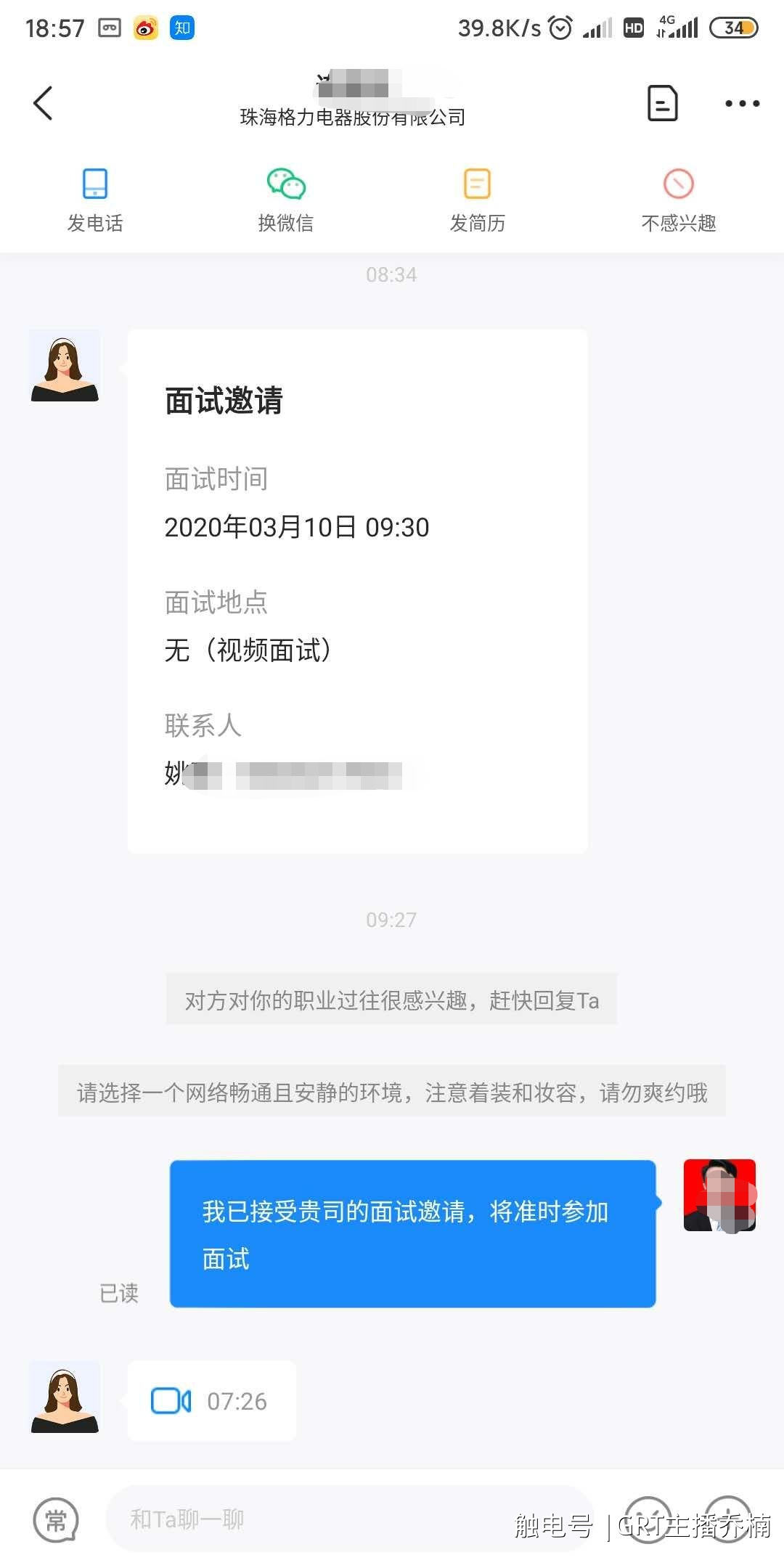 翁同学是机电工程学院2020届车辆工程专业毕业生,对于自己的就业方向和意向企业,翁同学一早就有明确的方向。得知学校和智联招聘联合举行了“空中双选会”,翁同学向格力电器发送了自己的简历,3月10日8点30分,他收到了格力电器的视频面试通知,9点30分,格力电器的人力资源工作人员对他进行了视频面试,在十多分钟的视频面试里,企业方向他了解了专业学习、岗位意向、薪资要求等情况,而他也积极向企业了解了工作内容、发展通道等情况。最后,格力电器的人力工作人员与翁同学约定保持进一步沟通。翁同学觉得这是目前情况下,学校和企业共同努力开辟的新的就业渠道,这也给毕业生带来了更多地选择机会。