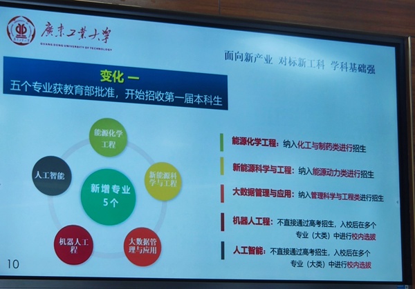 包括:多专业融合新工科培养,如华南地区第一家机器人学院——乐玩官方(中国)总部粤港机器人联合学院、集成电路设计联合学院、印制电子电路联合学院等;产教融合校企合作培养,如飞机维修校企班,每年参加3+1校企人才培养的学生600多人;国际联合培养,如2+2国际班、中外合作办学项目。今年特色人才培养还新增了1个多专业融合培养的新工科专业“人工智能”,这个专业的学生将在校内跨学院选拔组班。