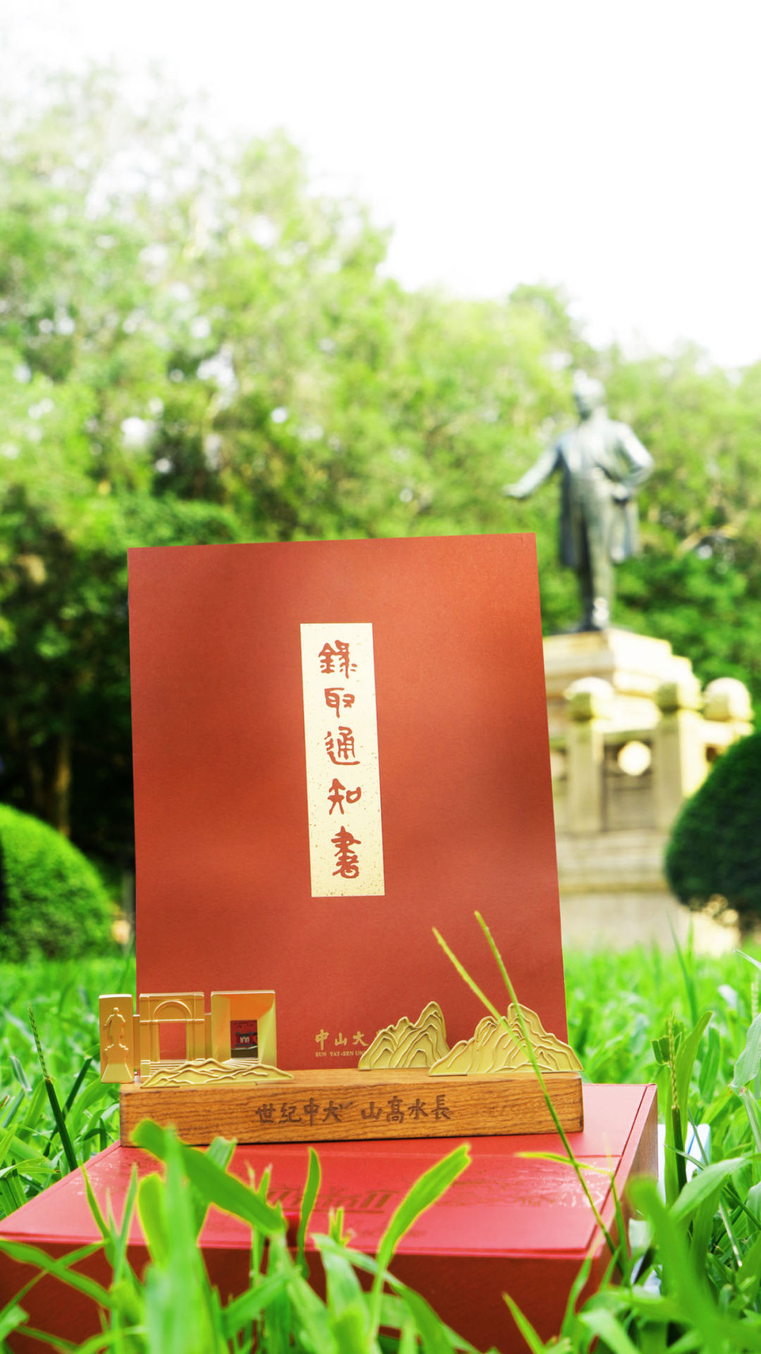 取出通知书的镂空灵感源自海棠式窗花,压印有“SUN YAT-SEN UNIVERSITY 100TH ANNIVERSARY”的字样,而展现大钟楼与怀士堂画面切换的镂空部分则呈现出圆形拱门造型。通知书取出后,支撑板底部则呈现中山大学中国语言文学系陈永正教授题写的中大世纪华诞主题“世纪中大,山高水长”的烫金字样。