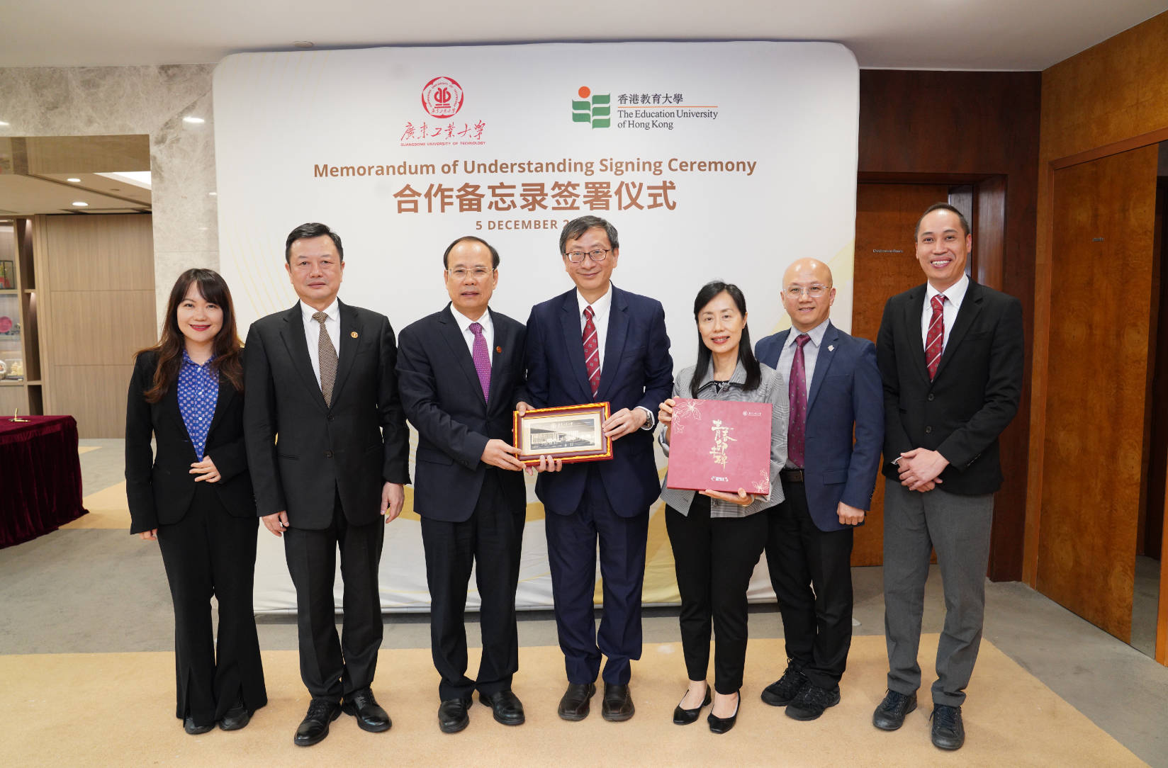 廣東工業大學校長邱學青教授(左三) 向香港教育大學校長李子建教授(右四)致送紀念品