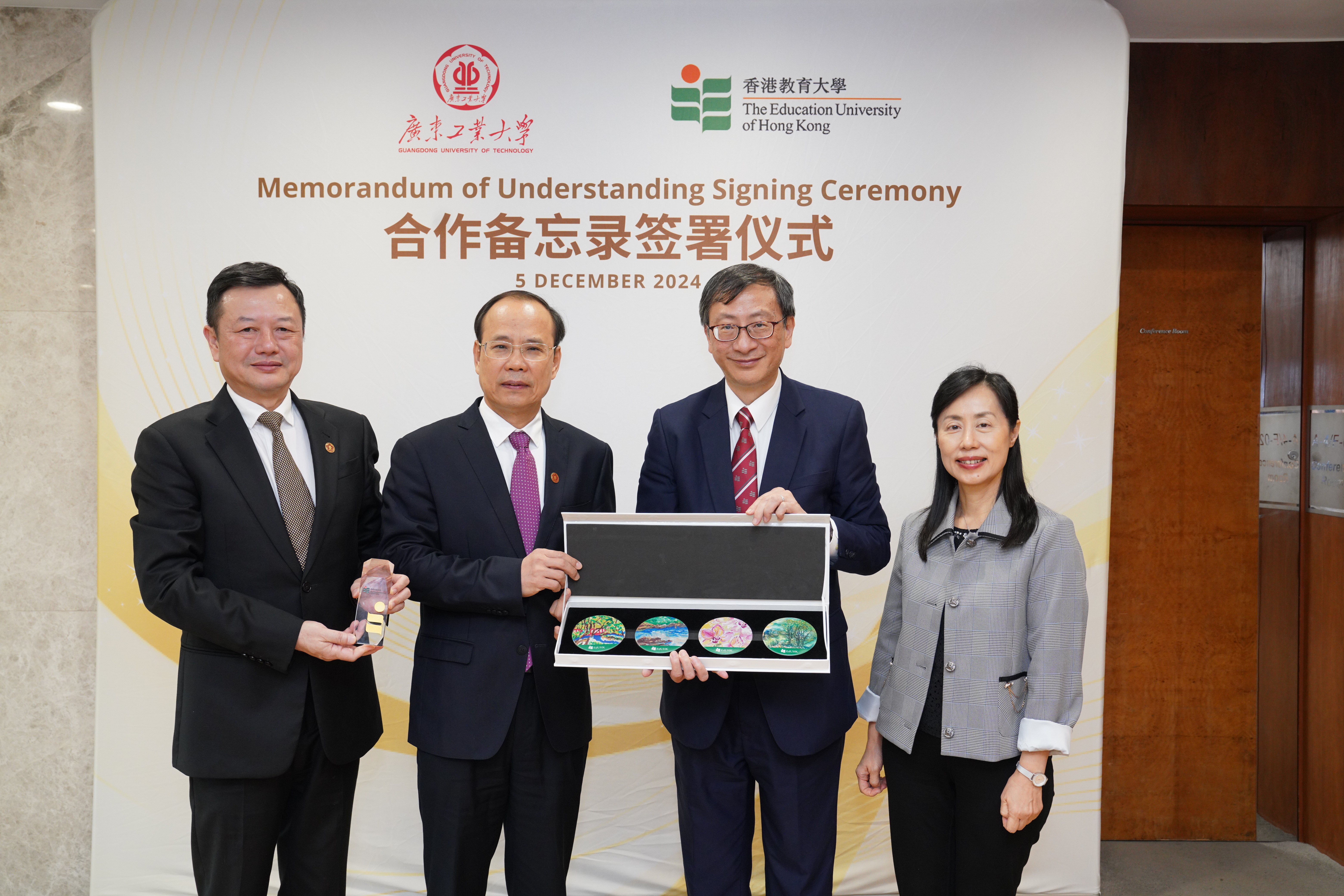 香港教育大學校長李子建教授(右二)向廣東工業大學校長邱學青教授(左二)致送紀念品