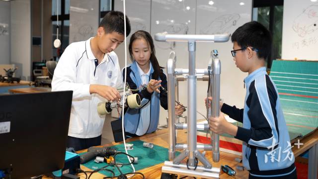 深圳明德实验学校(香蜜湖校区)学生们讨论汽车框架制作,培养科技创新思维。南方+记者 张梓望 摄
