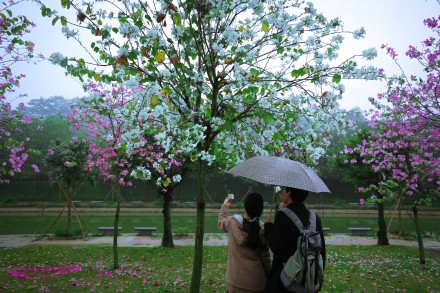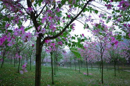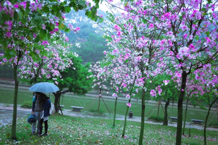 图书馆对面的紫荆花竞相怒放,灿烂了一段心情,芳华了整座校园。雨雾横飞的三月里,走在人工湖北侧的草坪上,几乎沉醉在整片整片的紫荆花海里。很多游客和学生把落花摆成各种字符,唯美程度不输玫瑰花束。