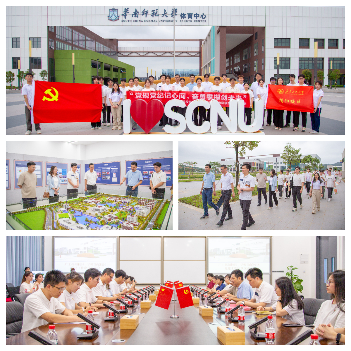 在华南师范大学汕尾校区,揭阳校区师生一行受到图书馆工会主席黄水清等师生的热情接待。双方师生在参观华师校史和汕尾校区展馆后,就校区办学情况、党建特色工作和学生党员教育培养等内容进行深入交流,共同推动双方党建联建共建向纵深发展。