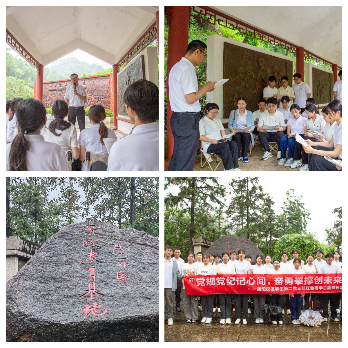 为深入学习贯彻习近平总书记关于党纪学习教育的重要讲话和重要指示精神,促进党员传承革命精神和优良作风,把纪律规矩转化为政治自觉、思想自觉、行动自觉,5月25日,揭阳校区学生第二党支部举行“党规党纪记心间,奋勇攀撑创未来” 红色研学主题党日活动。校区师生党员、团学骨干共25人参加活动。